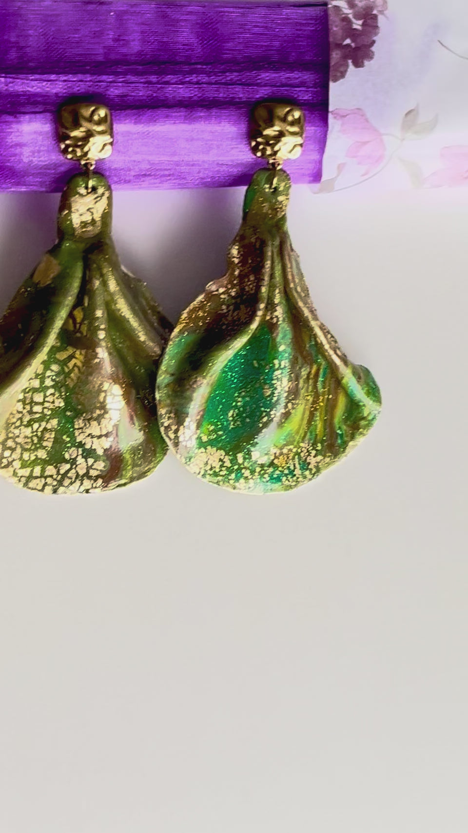 Ces boucles d’oreilles ont été entièrement façonnées à la main dans mon atelier. Chaque pièce est modelée en pâte polymère, puis sublimée par l’ajout de feuille décorative et protégée par un vernis transparent, pour apporter éclat et profondeur aux couleurs. Le rendu est fluide, lumineux, avec un effet presque textile qui capte la lumière à chaque mouvement.